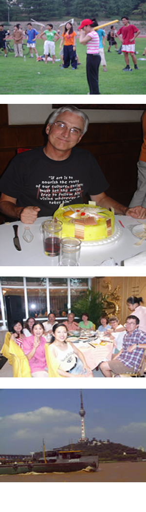 Most teachers spend their free time in the evenings either exercising, seeking out delicious chinese cuisine, and shopping. Wuhan, a city of 8 million prople, has much to offer everyone. There are three distinct districts in Wuhan, one of which is Hankou, a short ferry ride across the Yangtze, where teacher have found hours of entertainment shopping. Wuchang, known as the cultural & arts center, is where teachers find the best food, including Hu Bu Xiang, or "breakfast street." Many teachers buy bicycles as well, and there is a relaxing and peaceful route directly from campus around East Lake. East Lake National Park is also quite accessible.